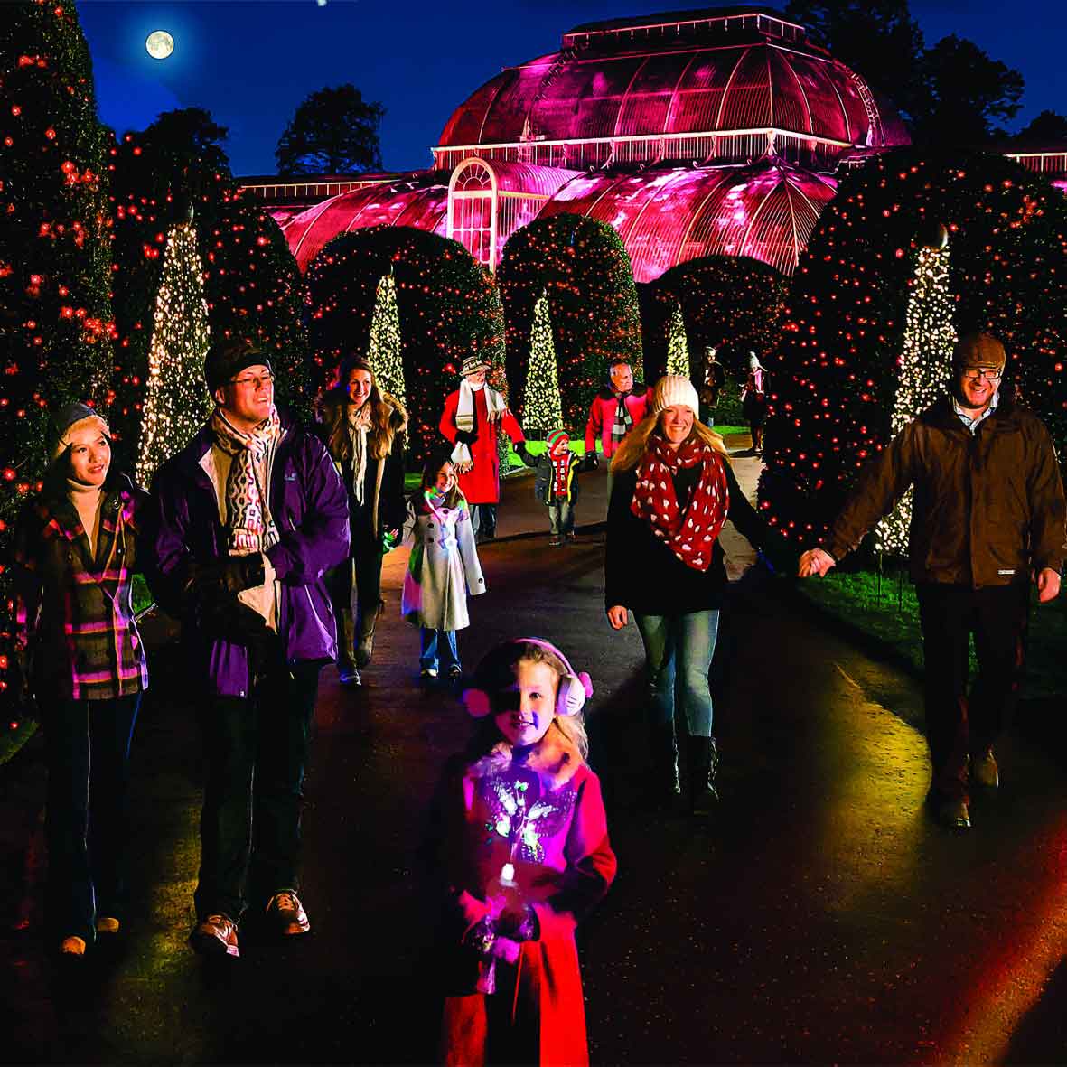 Wander between glowing waterside reflections, illuminated fountains and grand glasshouses as Kew’s iconic architecture and unique tree canopies are brought to life drenched in Christmas colour. Along the way, gaze at the giant light sculptures, bright and luminous, like fireworks frozen in time, walk the shimmering Tunnel of Lights and perhaps steal a kiss at Mistletoe Moments. Stand among twinkling holly bushes and Christmas trees festooned with seasonal cheer as plumes of fire dance to festive music from the Nutcracker set against a frosty, snow-flaked Palm House panorama.