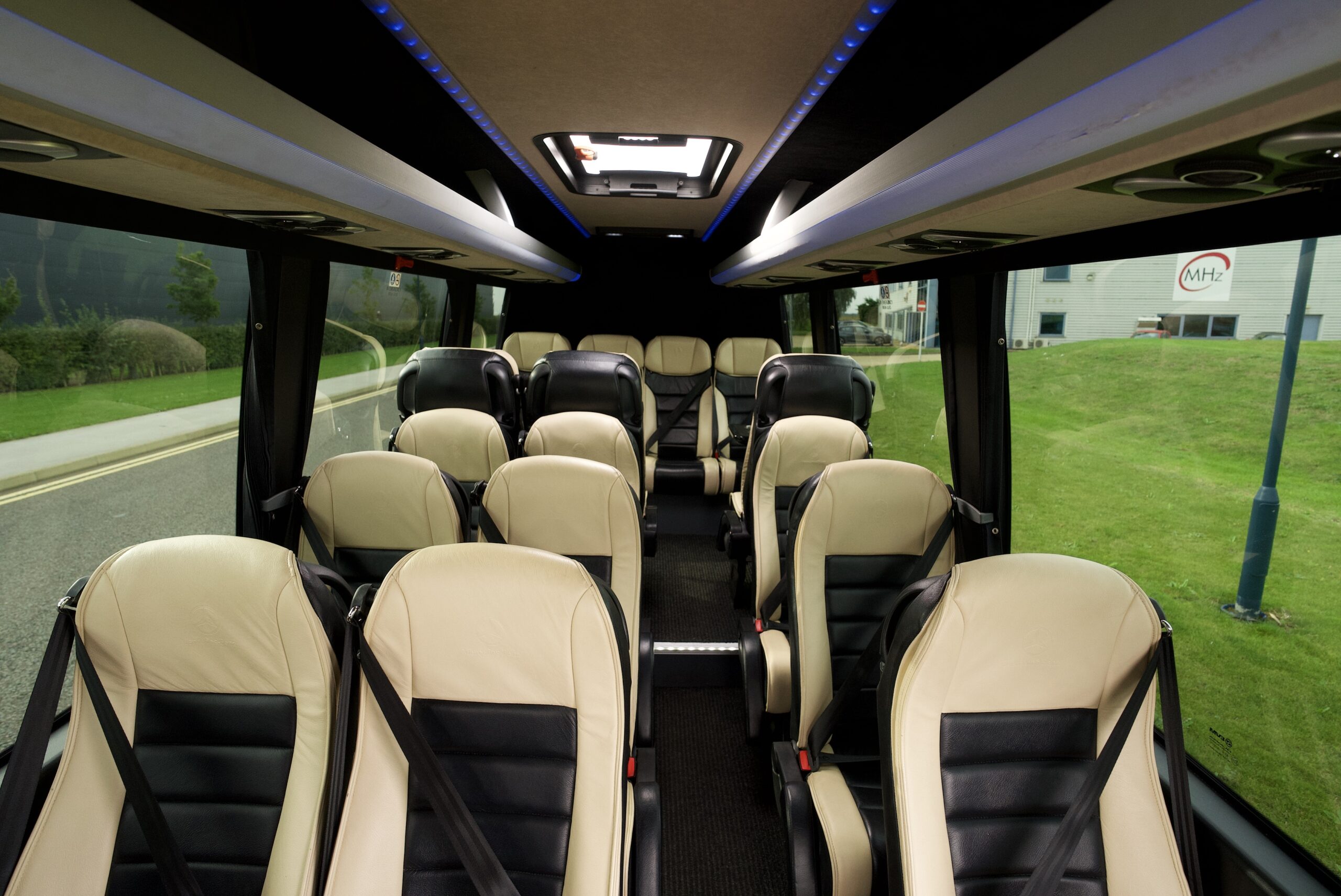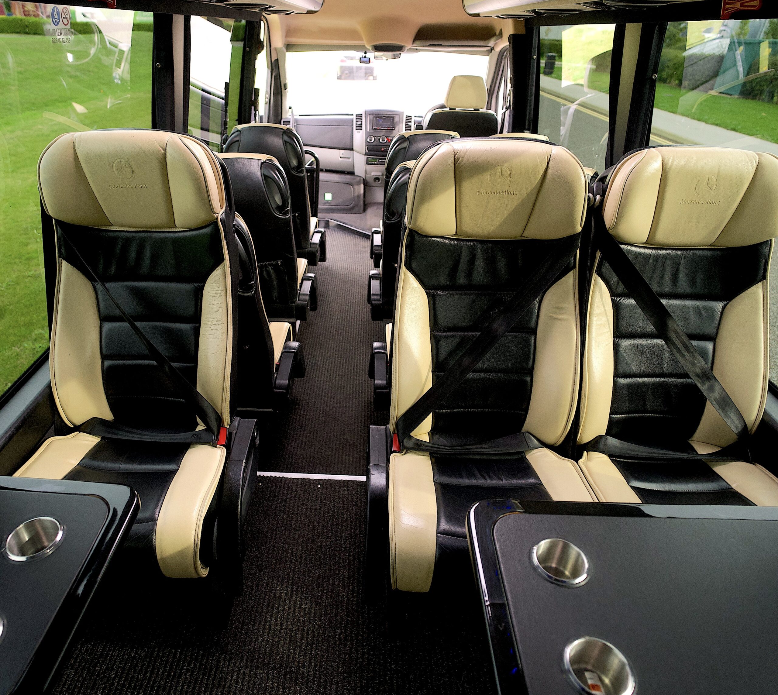 Here’s the newest addition to our fleet, the small and beatifully formed 16 Seat Luxury Mercedes Minibus, based in Cambridge. Relax and unwind in sumptuous black and cream leather seating whilst being entertained with a twin screen system for power point use.