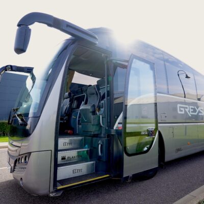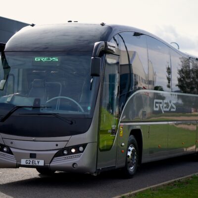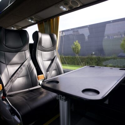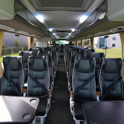 With 4 tables [two at the front near the entrance, and two at the rear, creating a rear “lounge- style” area], hot drinks facility, onboard WiFi an the ability to stream live content, this coach is perfect for a luxury day out or touring for the UK or Europe, and ideally suit high profile transfers, extended weekend breaks or holidays. This range of coach also offers 3-point belts on all seats, which therefore can be used with child seats.