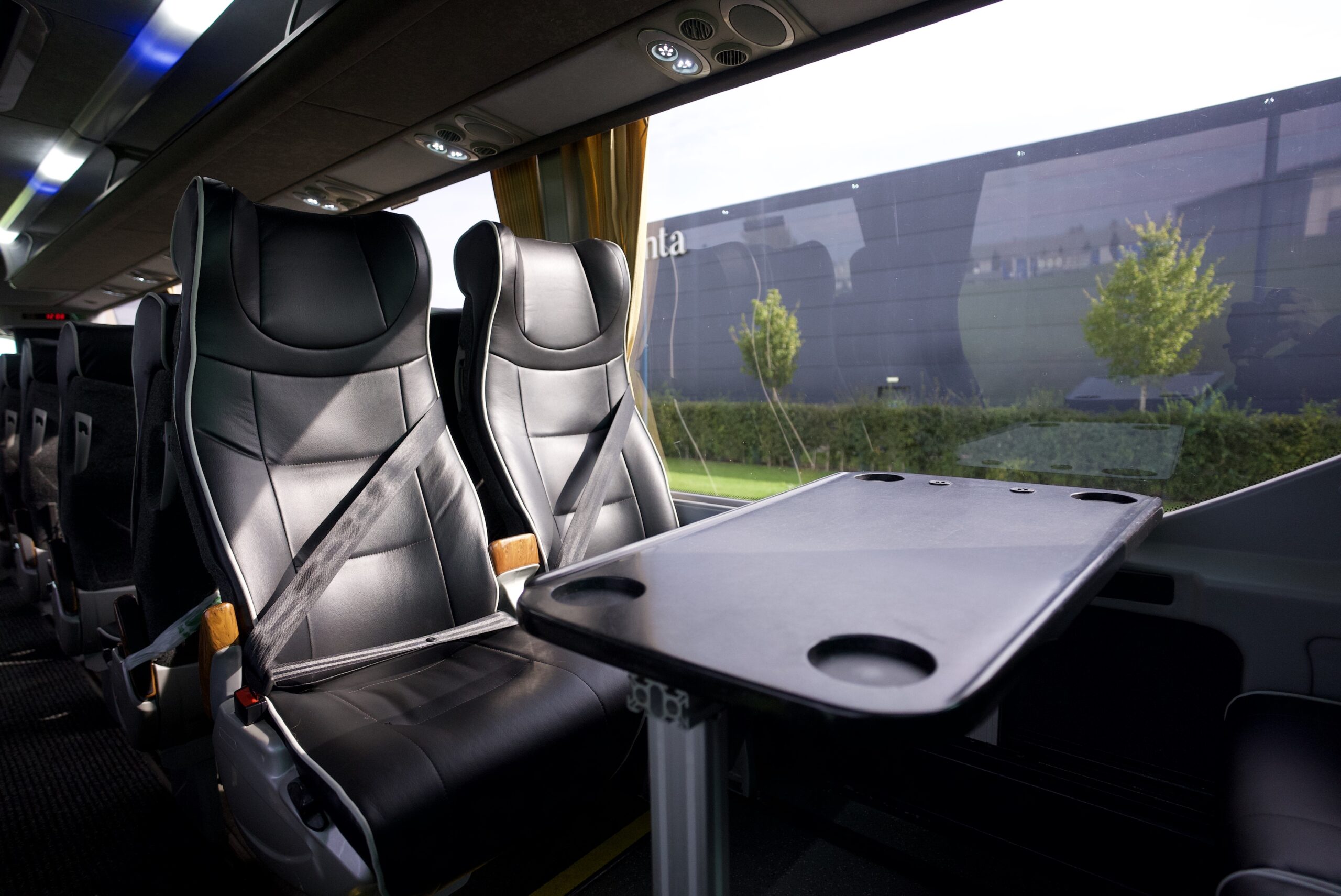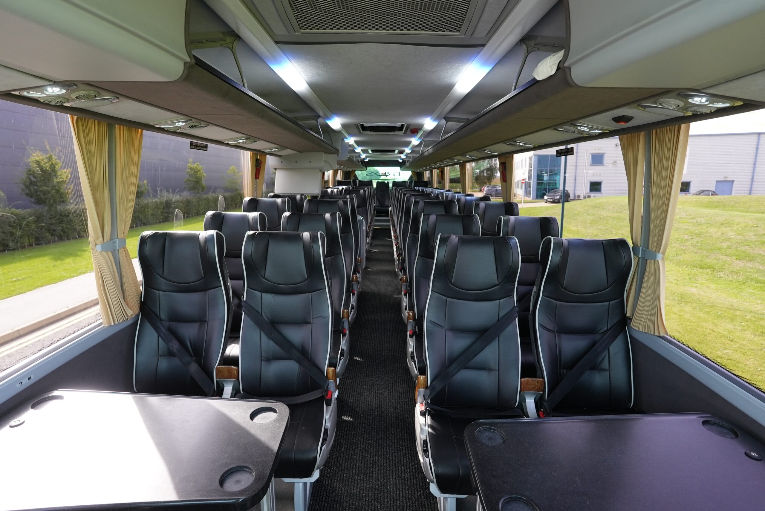 With 4 tables [two at the front near the entrance, and two at the rear, creating a rear “lounge- style” area], hot drinks facility, onboard WiFi an the ability to stream live content, this coach is perfect for a luxury day out or touring for the UK or Europe, and ideally suit high profile transfers, extended weekend breaks or holidays. This range of coach also offers 3-point belts on all seats, which therefore can be used with child seats.